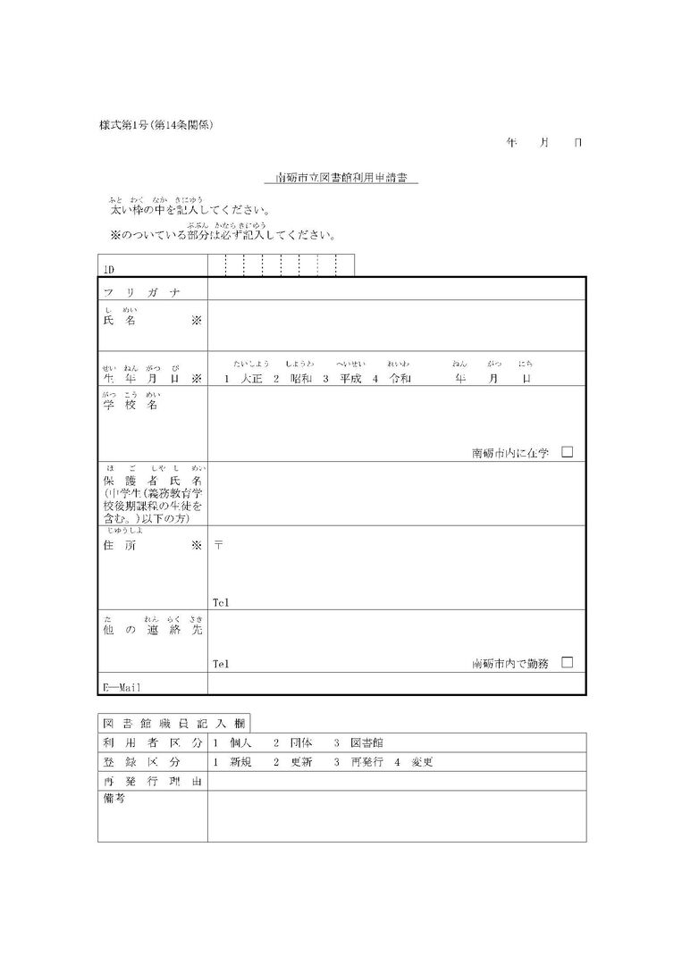 ・南砺市立図書館利用申請書(すでに利用カードをお持ちの方は不要)